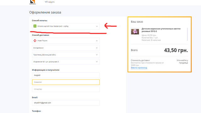 - Вкажіть спосіб оплати "Оплата картою Visa MasterCard